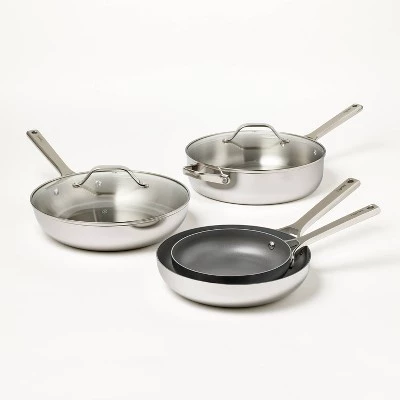 - Aluminum cores are fully surrounded by two layers of stainless steel for quick and even heat distribution