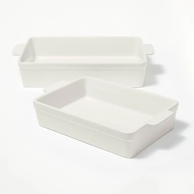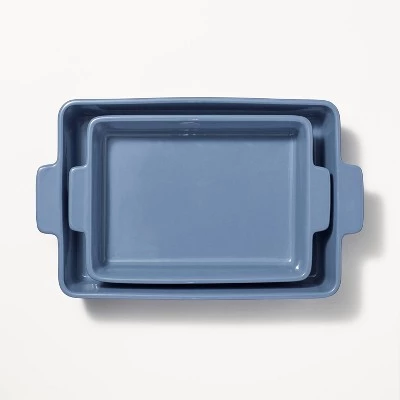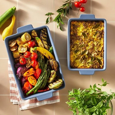 Refresh your bakeware collection for whipping up easy dinners or delicious desserts with this 2-Piece Stoneware Rectangle Baking Dish Set from Figmint™. Featuring a sturdy stoneware construction that’s dishwasher, microwave and freezer safe and oven safe up to 500 degrees Fahrenheit, these solid-color rectangle baking dishes also feature side handles for easy carrying to and from the oven. And with one 4.1-quart and one 2-quart dish, you’ll have just what you need to tackle a wide variety of recipes.