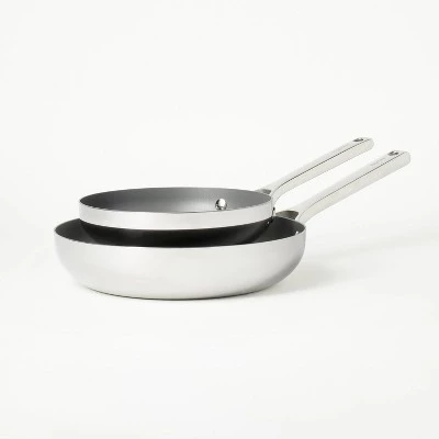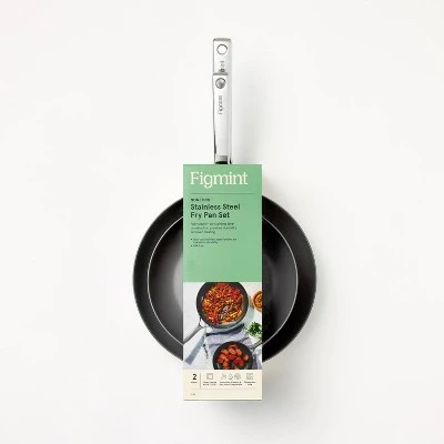 With this 2-Pack (8-Inch & 10-Inch) Nonstick Stainless Steel Frypan Set from Figmintâ„¢, you get two excellent frypans for cooking meals of different sizes. This set comes with 8-inch and 10-inch frypans, both designed with aluminum cores surrounded by two layers of stainless steel for quick and even heat distribution. The pans have smooth surfaces with long-lasting nonstick coating for convenient use, and they are compatible with electric, gas and induction stoves and also oven safe up to 450 degrees Fahrenheit.