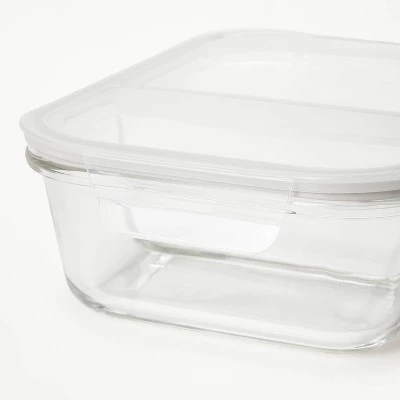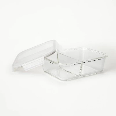 Meal prep or pack lunches for work with the help of this Glass Bento Food Storage Container from Figmint™. Made from clear glass, this six-cup bento container features two divided compartments, making it perfect for separating veggies from dip or entrees from sides. The snap lid locks in freshness and helps keep the contents secured, and the container is dishwasher and freezer safe for easy cleaning and storage.